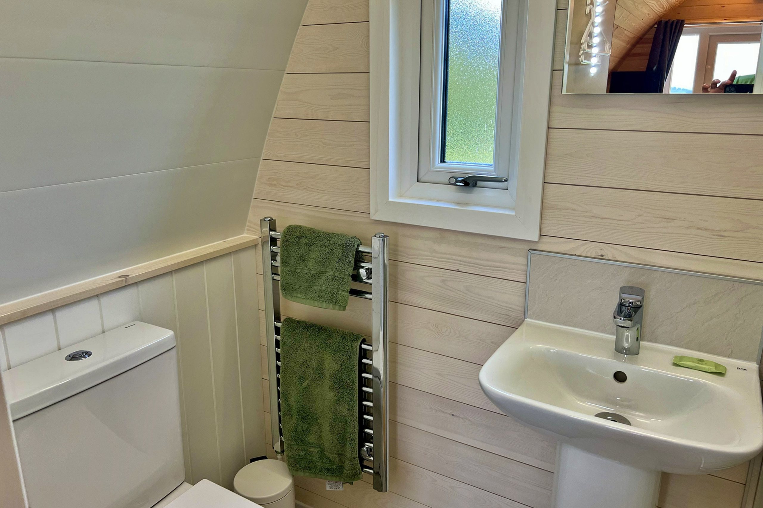 Inside, the pod has been carefully designed to provide everything you need for a comfortable stay. It sleeps up to 2 adults and 2 children, with a double bed and a pull-out sofa bed. The compact kitchen is well-equipped for preparing simple meals, including a fridge with freezer box, microwave, air fryer, toaster, kettle, and all essential utensils. There’s also a private shower room, along with added comforts such as underfloor heating, WiFi, USB charging points, and a Smart TV. Bedding and towels are provided, so you can settle in as soon as you arrive.