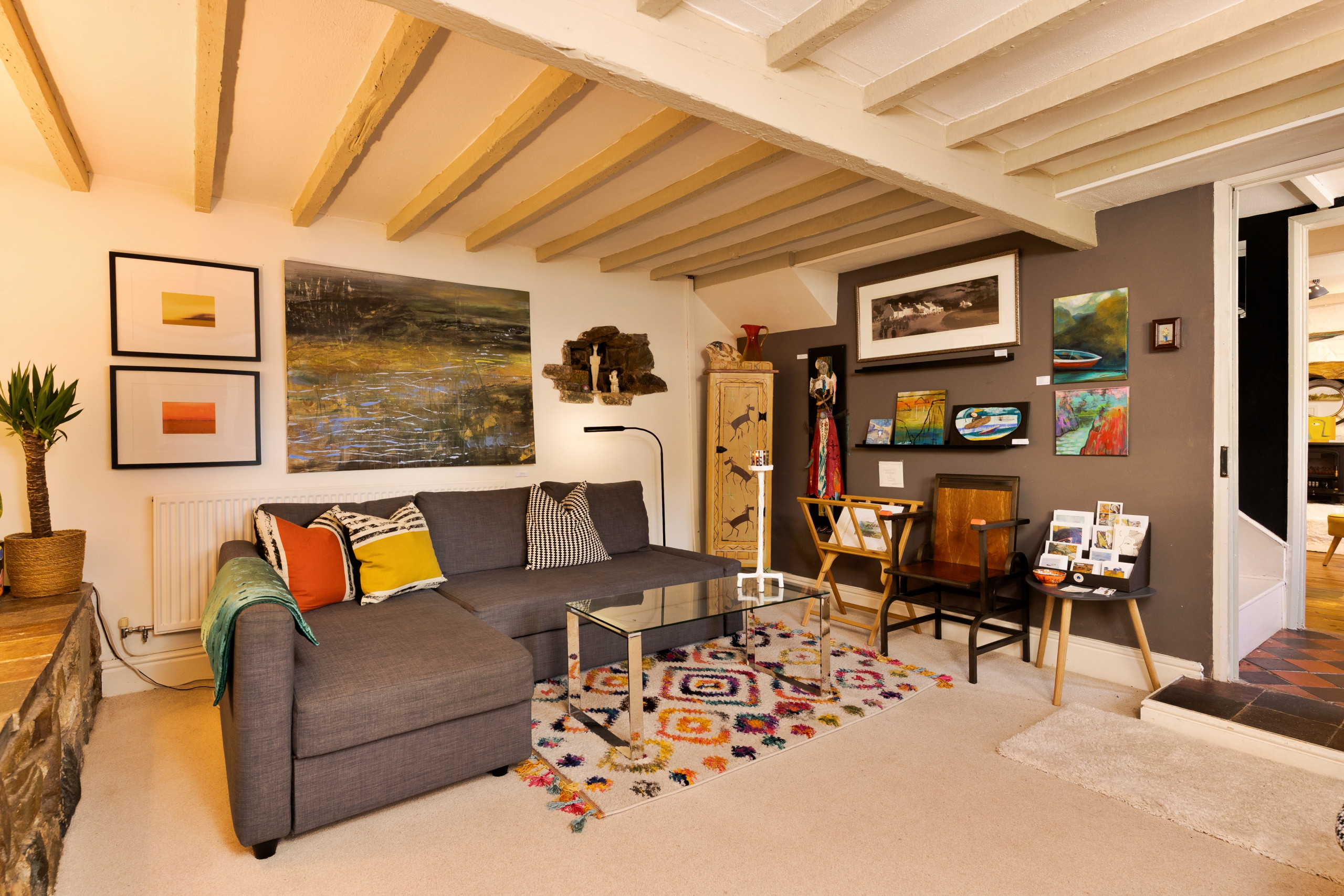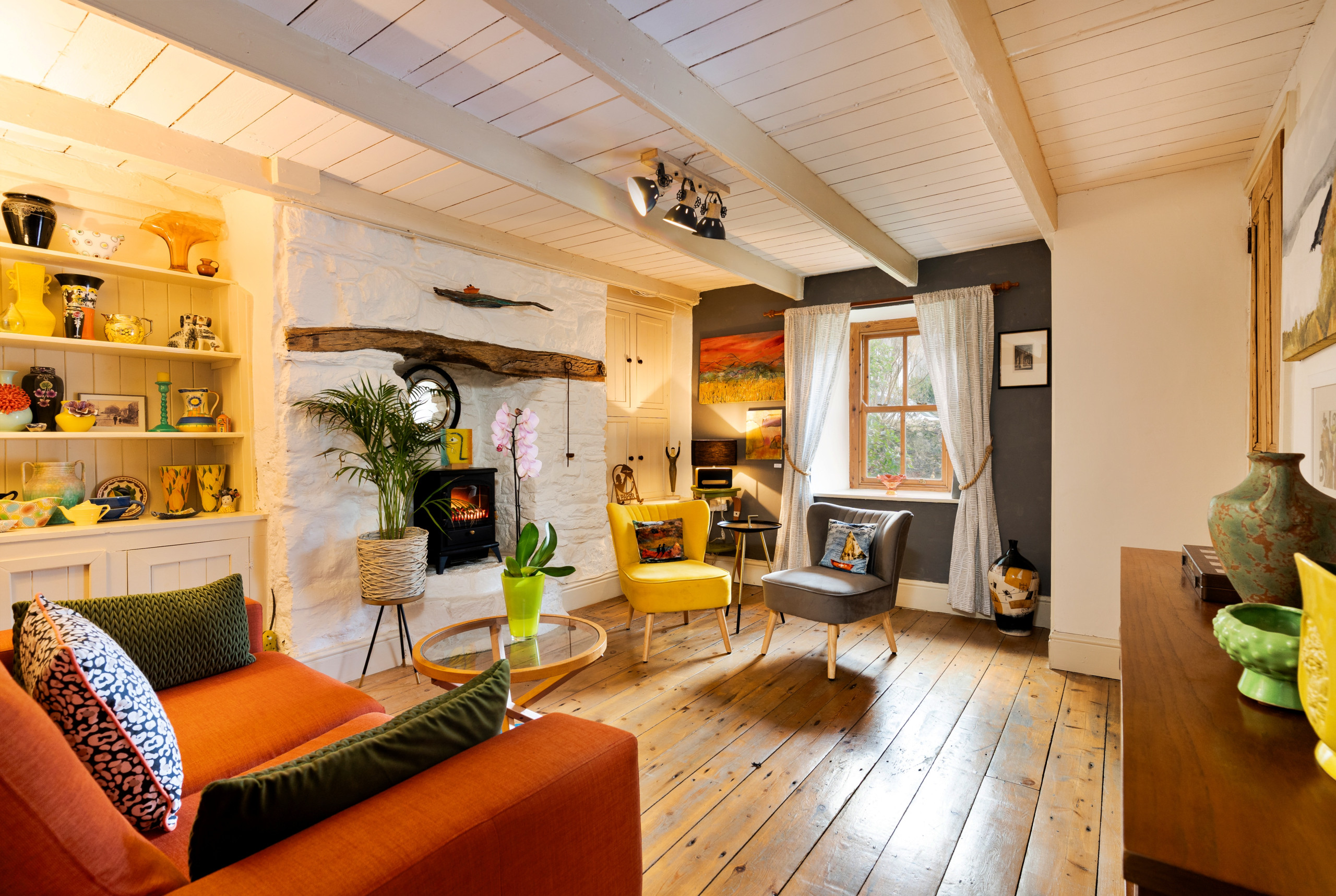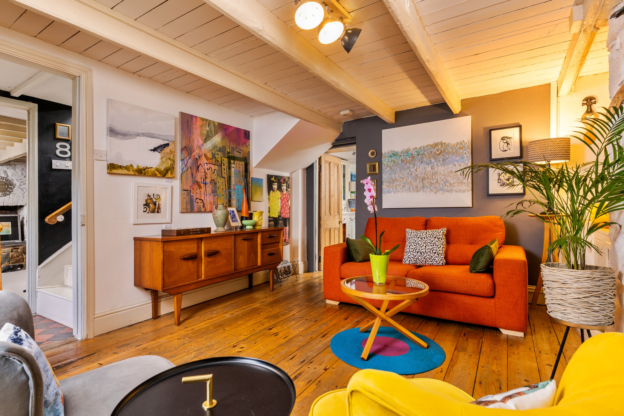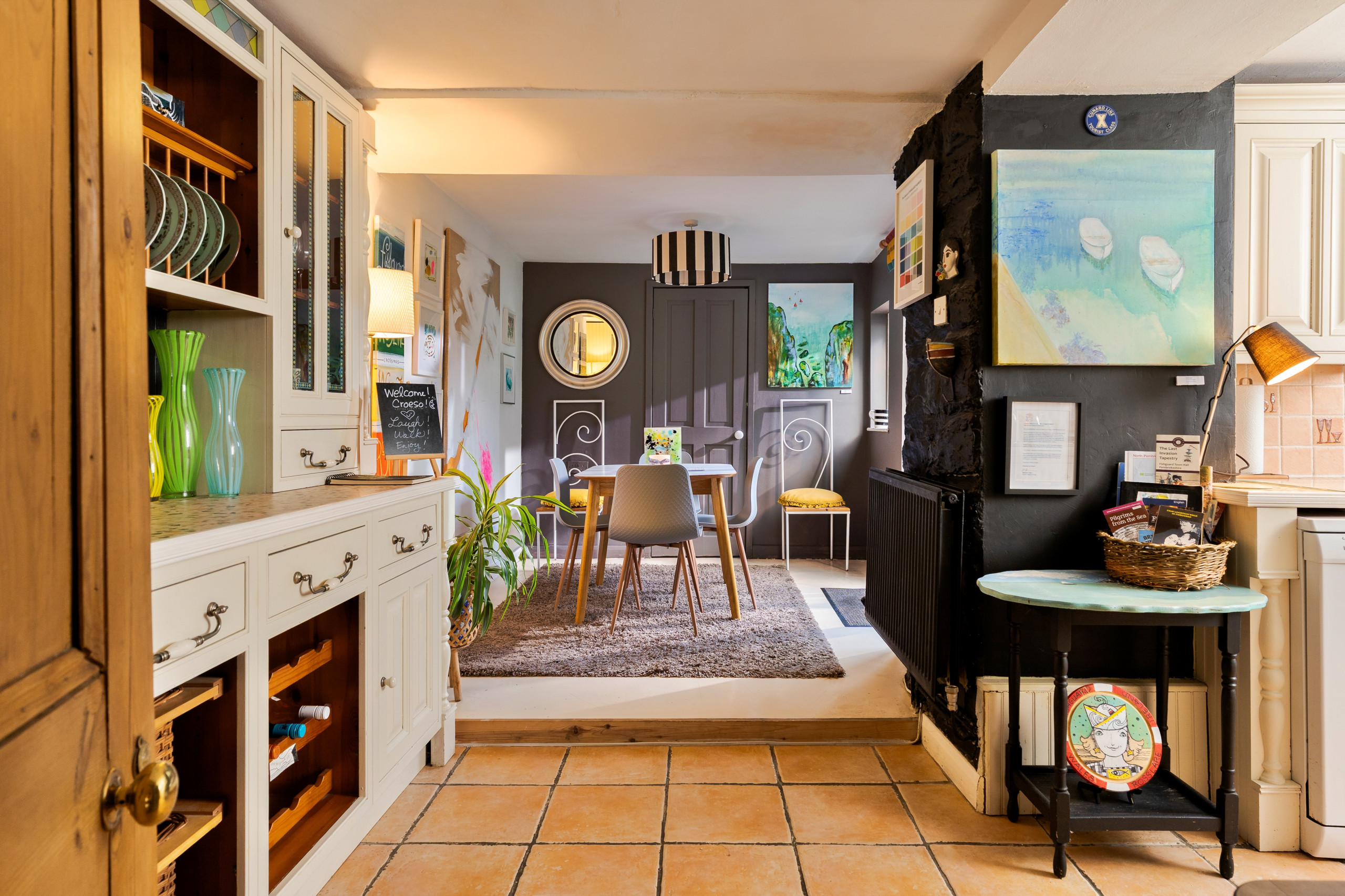 Wallis Cottage is more than a place to stay — it’s a living art gallery and a creative retreat by the sea. Nestled in the heart of historic Fishguard, this lovingly restored late-1700s cottage blends centuries of character with mid-century modern style, comfort, and colour.