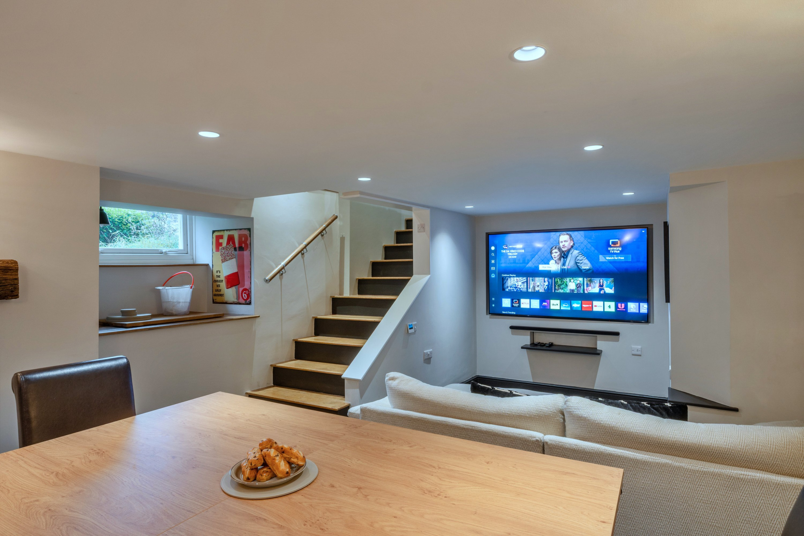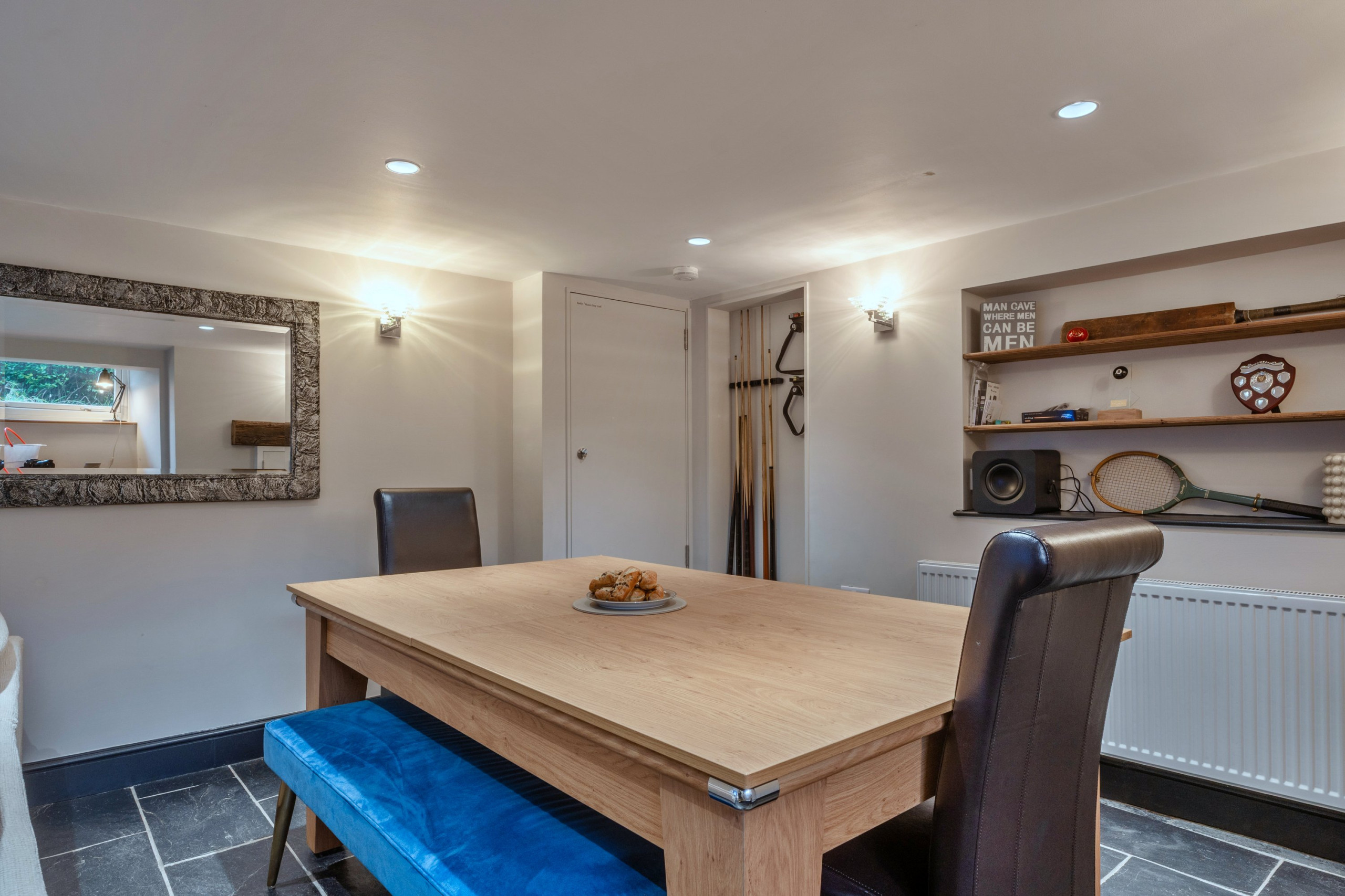 Inside you’ll find two living areas, giving everyone space to relax. The main lounge has a log burner for cosy evenings, while downstairs there’s a second lounge with a large Smart TV, comfortable seating and a pool table that converts into a dining table - ideal for easy group meals and a bit of fun after the beach!